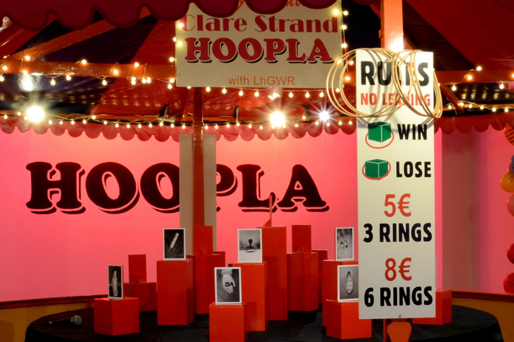 All that Hoopla, is a customised, working installation of a fairground Hoopla Stall.The stall comes with signs, Clare Strand Hoopla balloons for the losers, music, microphone, twinkling lights and fairground smells.