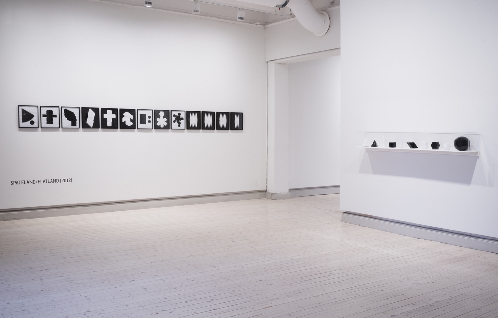 Adjacent Flatland Spaceland (2012) is a work that references the 1884 book Flatland written by Edwin Abbott Abbott. The story, nar- rated by a square who transforms into a cube, exalts dimensional travel from 2D to 3D and beyond. It also references class, gender, and hierarchies, highlighting the importance of questioning one’s beliefs, the embracing of critical thinking and openness to experi- ences beyond one’s own. Using this as an analogy for the photo- graphic medium, Strand presents us with a series of 3D geometric shapes constructed out of processed photographic paper alongside their 2D templates. Here Strand seems to suggest that photography needn’t be square, flat or representational.
